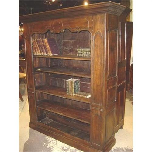 This bookcase was constructed from the frontage of a lit clos. The material is chestnut wood, and we believe it be built in the early 1900's. It's in very good condition. Please note that the back of the bookcase is OPEN. H=76, W=65 1/2, D=19 1/2 (includes crown)