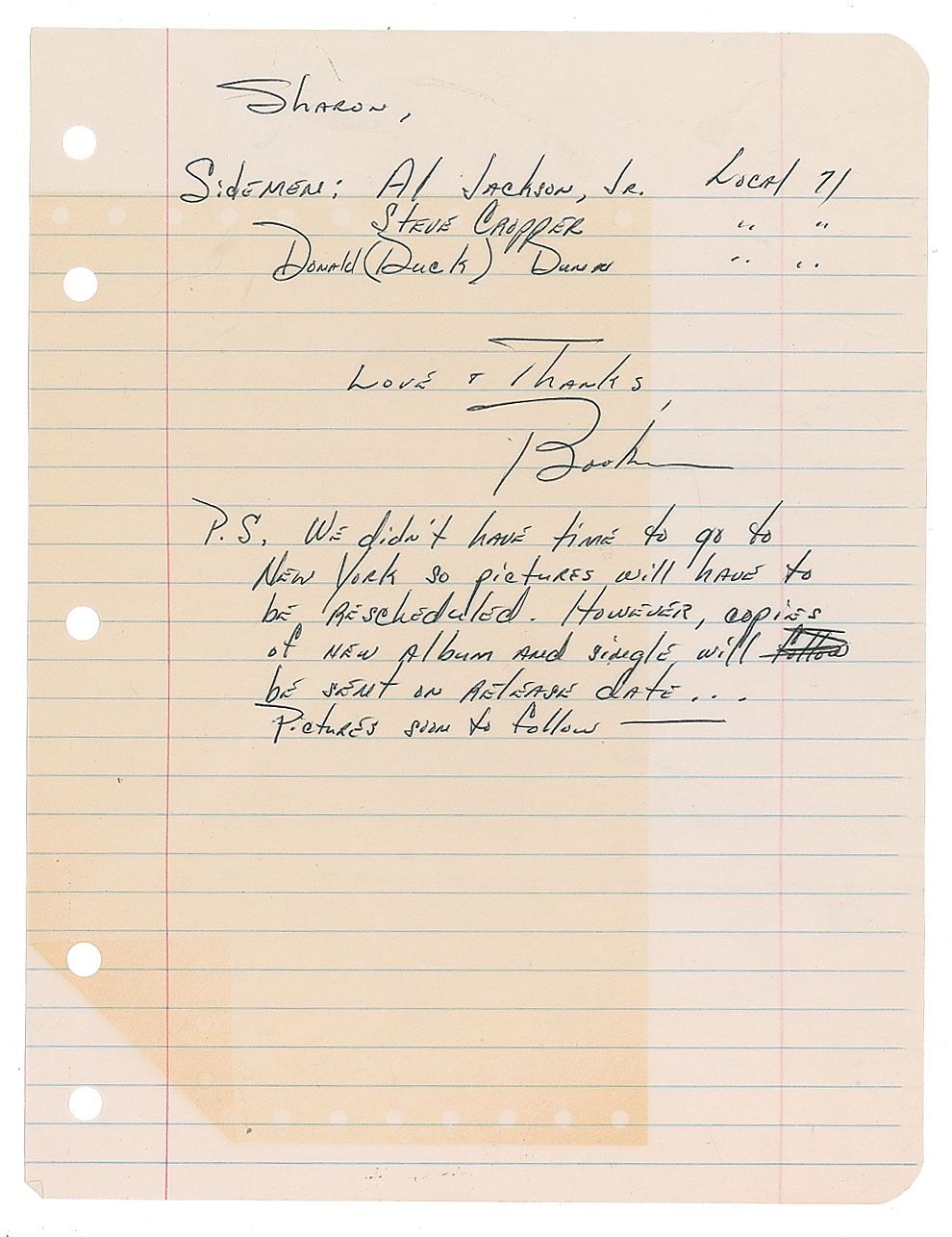 Multi-instrumentalist, songwriter, record producer, and arranger (born 1944) best known as the frontman of the band Booker T. & the M.G.'s. ALS signed “Booker,” one page, 8 x 10.5, no date. Letter to "Sharon," naming the members of the M.G.'s, "Sidemen: Al Jackson, Jr., Steve Cropper, Donald (Duck) Dunn," and adding a postscript: "P.S. We didn't have time to go to New York so pictures will have to be rescheduled. However, copies of new album and single will be sent on release date…Pictures soon to follow." In fine condition, with a light block of toning over much of the letter. Accompanied by a publicity photo of Jones and his band.