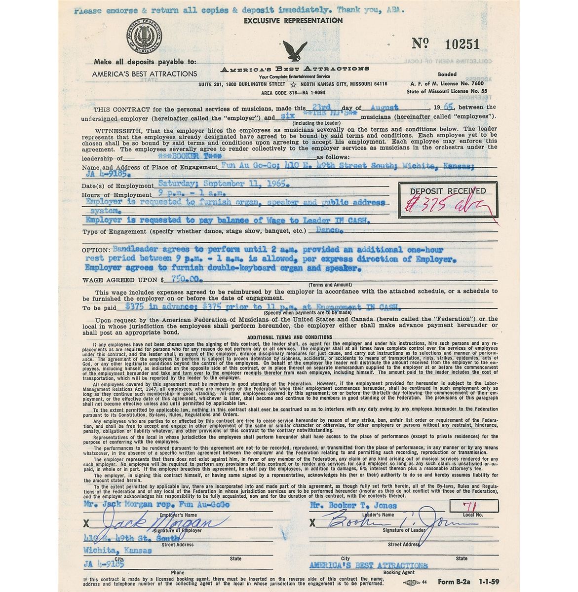 DS, one page both sides, 8.5 x 11, August 23, 1965. Agreement for Booker T. to play a four-hour gig at the Fun Au Go-Go in Wichita, Kansas, for a fee of $750 dollars, with half paid in advance. Signed at the conclusion by Jones. In fine condition, with expected light document wear.