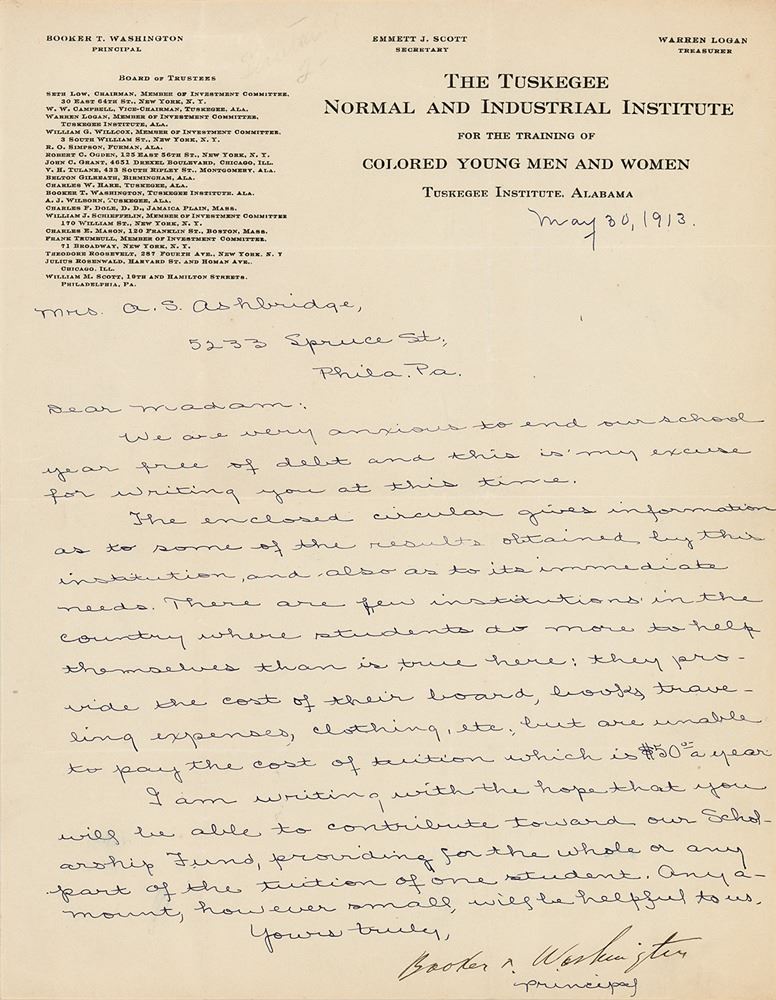 LS, one page, 8.5 x 11, Tuskegee Normal & Industrial Institute letterhead, May 30, 1913. Letter to Mrs. A. S. Ashbridge, a potential benefactor, in part: "We are very anxious to end our school year free of debt and this is my excuse for writing you at this time. The enclosed circular gives information as to some of the results obtained by this institution, and, also as to its immediate needs. There are few institutions in the country where students do more to help themselves than is true here: they provide the cost of their board, books, traveling expenses, clothing, etc., but are unable to pay the cost of tuition which is $50 a year. I am writing with the hope that you will be able to contribute toward our Scholarship Fund, providing for the whole or any part of the tuition of one student. Any amount, however small, will be helpful to us." In fine condition.