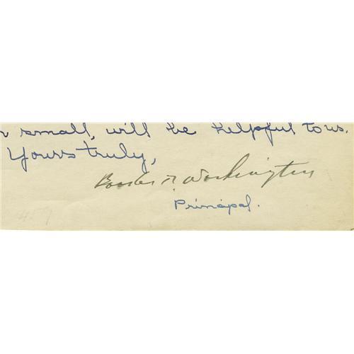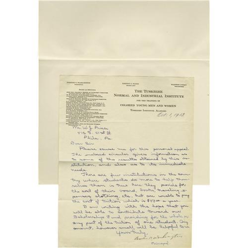 <B>Booker T. Washington Letter Signed.</B></I> One page manuscript, 8.5" x 11", written on Tuskegee Normal and Industrial Institute stationery, Alabama, October 1, 1913, asking Mr. W. J. Price for donations of cash or items to help students with expenses. The letter is in fine condition; normal folds are present; laid into a folder where it is folded in half. <I>From the Henry E. Luhrs Collection.</B></I>