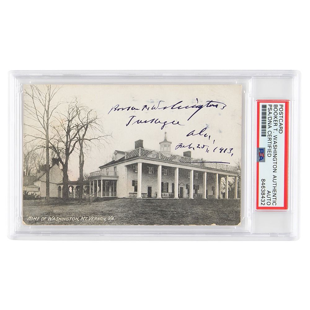 Unusual 5.25 x 3.5 postcard depicting George Washington's home at Mt. Vernon, Virginia, signed in fountain pen, "Booker T. Washington, Tuskegee, Ala., Feb. 25, 1913." In fine condition. Encapsulated in a PSA/DNA authentication holder.