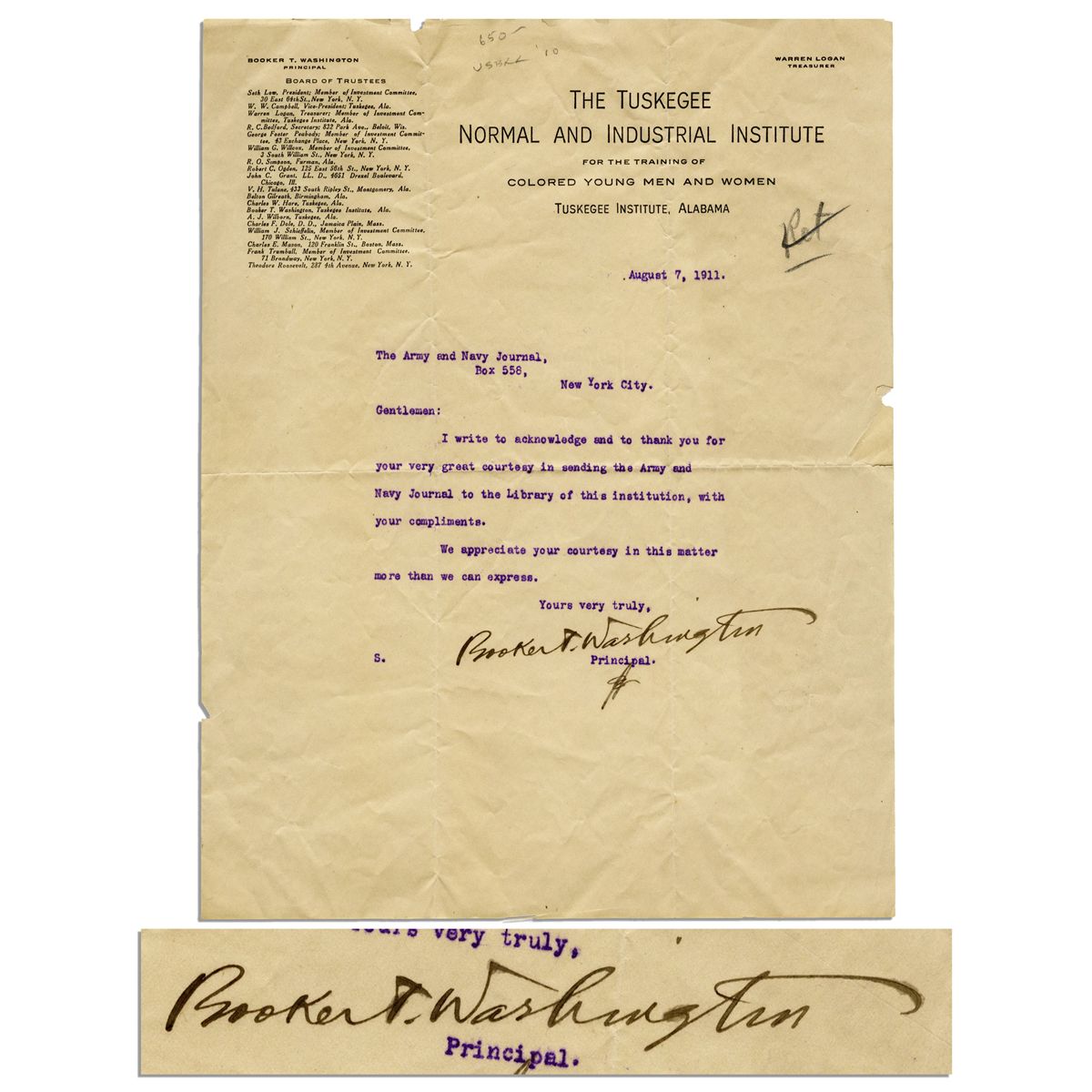 Booker T. Washington signs this letter to the Army and Navy Journal, dated 7 August 1911. Written in purple type on ''The Tuskegee Normal and Industrial Institute,'' Washington thanks the organization for ''sending the Army and Navy journal to the Library of this institution'' and signs, ''Booker T. Washington'' as the principal of the Tuskegee Institute. 8.5'' x 11'' letter is in very good condition with minor toning and chipping. Some small pencil markings are present.