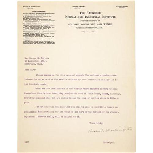 <B>Booker T. Washington. TLS.</B></I> A one-page typed letter on Tuskegee Institute letterhead signed by Booker T. Washington as Principal May 10, 1915. The letter is an appeal for funds for scholarships. One fold in center, otherwise in very nice crisp condition. Washington, an educator and social activist, was born into slavery in 1856, and recounted his childhood in his book <I>Up from Slavery</B></I>. He founded and ran the Tuskegee Normal and Industrial Institute and became one of the most controversial leaders of his time. He was at odds with other civil rights figures such as W.E.B. Du Bois because he advocated self-help through economic means rather than through basic civil and political rights.<BR><BR><b>Shipping:</b> Books & Catalogs (<a target="_blank" href="http://www.heritageauctions.com/common/shipping.php">view shipping information</a>)