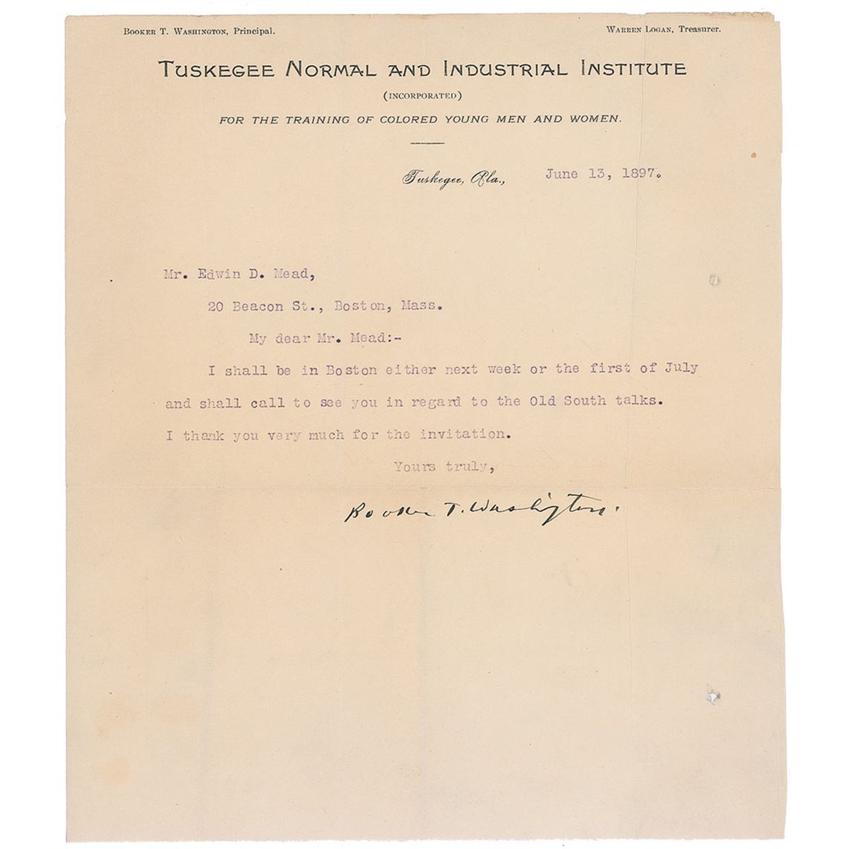 TLS, one page, 8.5 x 9.75, Tuskegee Norman and Industrial Institute letterhead, June 13, 1897. In a letter to Edwin D. Mead, Washington writes, in full: “I shall be in Boston either next week or the first of July and shall call to see you in regard to the Old South talks. I thank you very much for the invitation.” In very good condition, with intersecting folds, one of which passes through the last letter of the first name, surface creasing, uniform toning, an area of separation at the end of the horizontal fold, and a few small tack holes along the right edge.