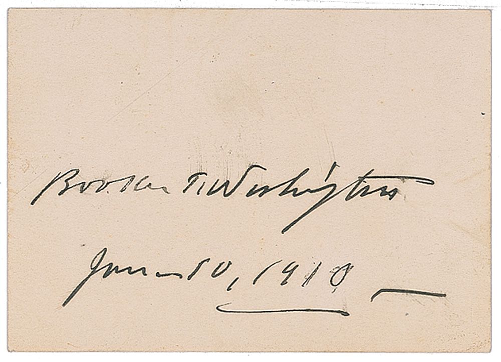 Ink signature, “Booker T. Washington, Jan. 10, 1910,” on an off-white 3 x 2 card. In fine condition, with a couple surface impressions to the card and a mild brush to the signature.