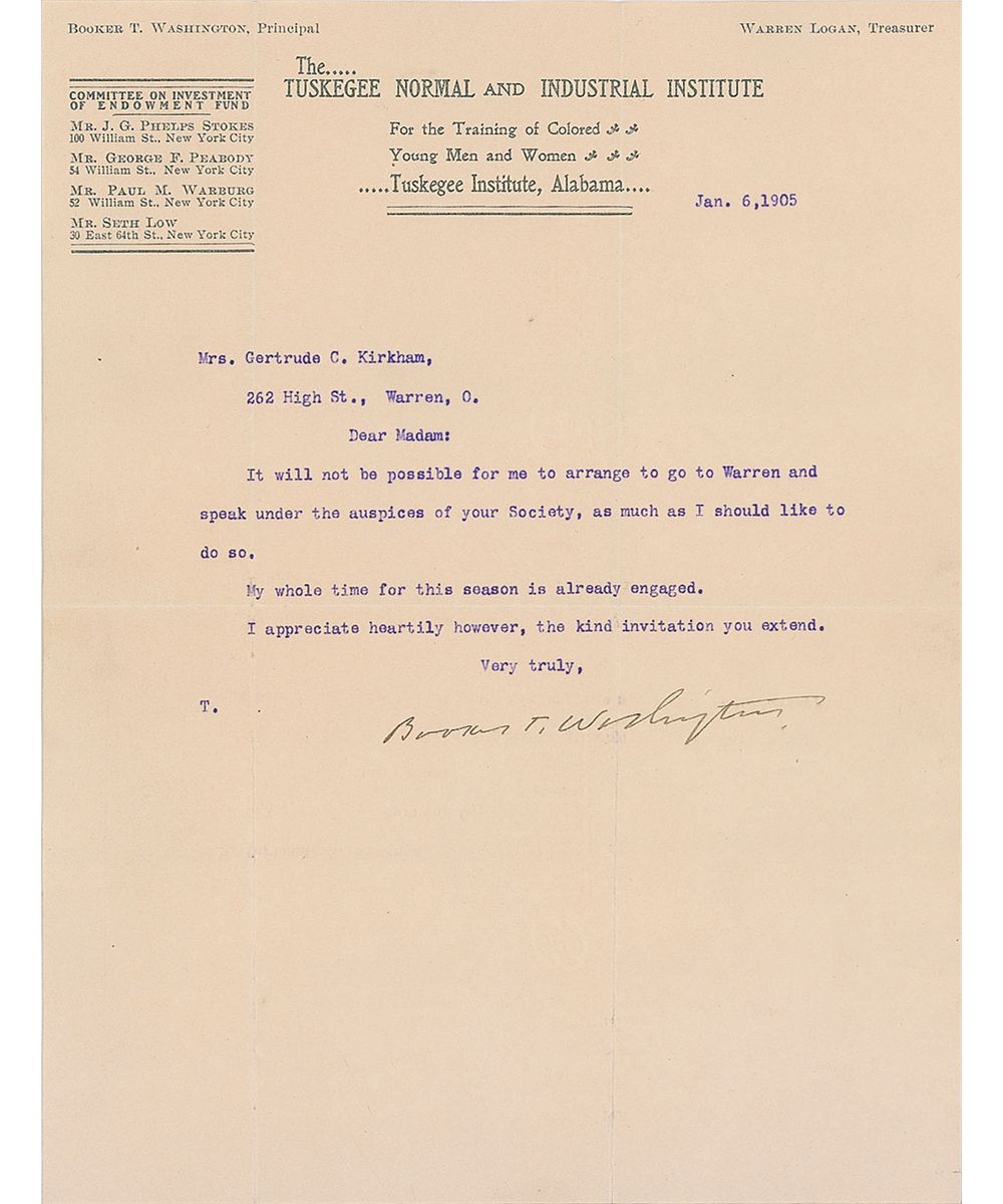 TLS, one page, 8 x 10.5, Tuskegee Normal and Industrial Institute letterhead, January 6, 1905. Letter to Gertrude C. Kirkham. In part: “It will not be possible for me to arrange to go to Warren and speak under the auspices of your Society, as much as I sh