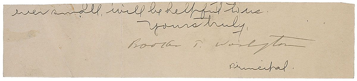 Ink signature, “Booker T. Washington,” on an off-white 8.5 x 2 slip clipped from the close of a manuscript letter. Three vertical folds (one passing through a single letter of the signature), otherwise fine condition.