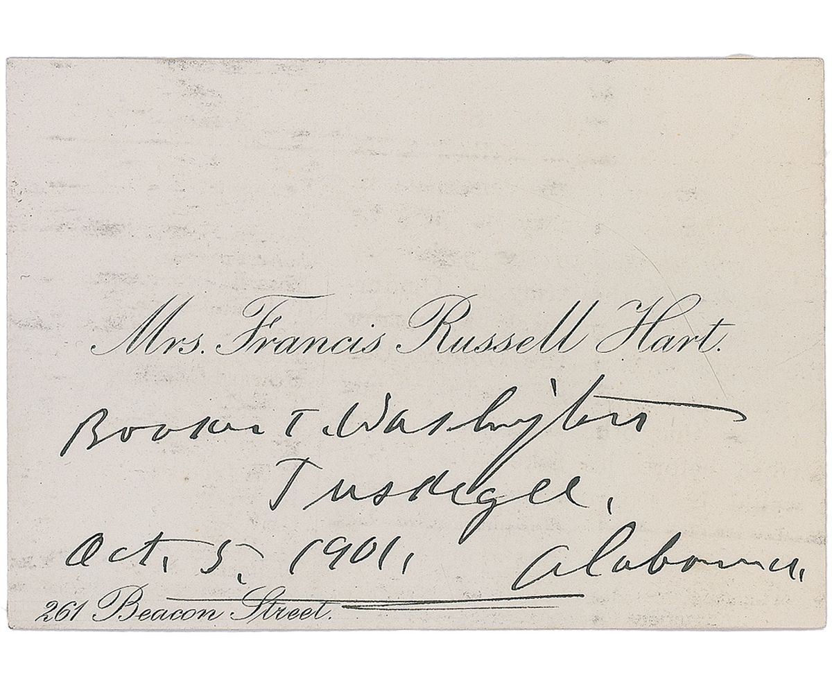 Bold ink signature, “Booker T. Washington, Tuskegee, Alabama, Oct. 5, 1901,” on an off-white 3.25 x 2.25 calling card of Mrs. Francis Russell Hart. In fine condition, with light scattered soiling.
