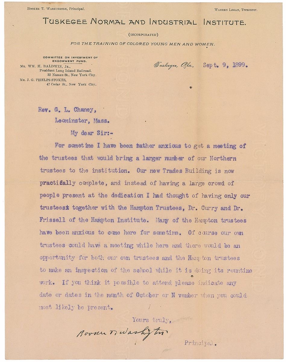 TLS, one page, 8.5 x 11, Tuskegee Normal and Industrial Institute letterhead, September 9, 1899. Letter to G. L. Chaney, in part: “For sometime I have been rather anxious to get a meeting of the trustees that would bring a larger number of our Northern Trustees to the institution. Our new Trades Building is now practically complete, and instead of having a large crowd of people present at the dedication I had thought of having only our trustees together with the Hampton Trustees, Dr. Curry and Dr. Frissell of the Hampton Institute. Many of the Hampton trustees have been anxious to come here for sometime.” In fine condition, with slight toning to intersecting folds (one vertical fold passing through a single letter of the signature) and a couple tiny blots of ink. Accompanied by an unsigned photo of Washington.