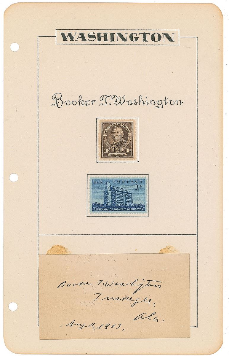 Bold ink signature, “Booker T. Washington, Tuskegee, Ala., Aug. 11, 1903,” on an off-white card with a handsome 6 x 9.5 album page hand-embellished with a calligraphic title and a pair of postage stamps honoring Washington’s legacy (card no longer affixed). In fine condition.