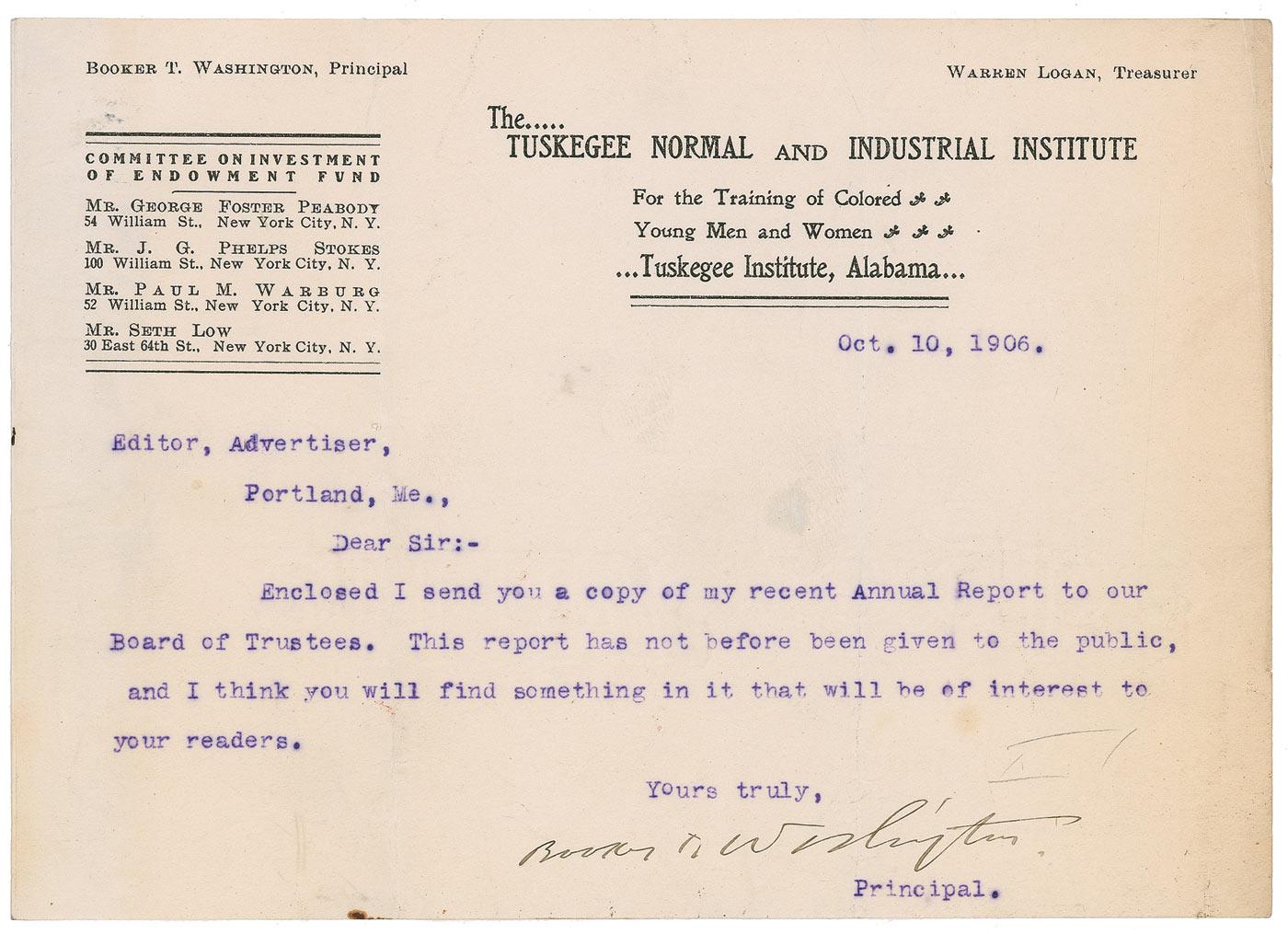 TLS, one page, 8.5 x 6, Tuskegee Normal and Industrial Institute letterhead, October 10, 1906. Letter to the editor of the Advertiser newspaper in Portland, Maine. In full: “Enclosed I send you a copy of my recent Annual Report to our Board of Trustees. This report has not before been given to the public, and I think you will find something in it that will be of interest to your readers.” In very good condition, with two vertical folds, one of which passes through Washington’s last name, mild creasing and edge toning, and signature a shade light. Pre-certified PSA/DNA and RRAuction COA.