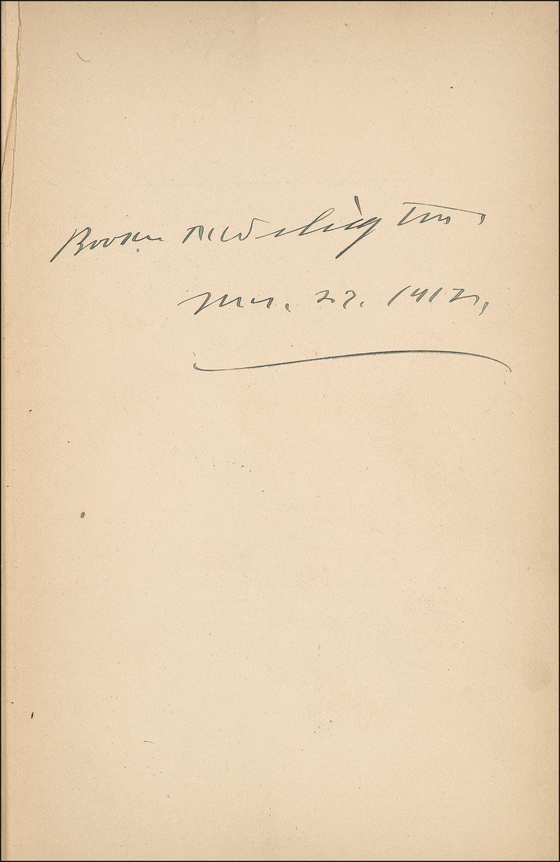 Signed book: Tuskegee and its People. First edition, first printing (library copy). NY: D. Appleton and Co., 1910. Hardcover, 5.5 x 8.25, 354 pages. Signed on the detached first free end page, “Booker T. Washington, May 27, 1912.” In very good condition, with several library stamps, partial separations along front and back hinges, library bookplate affixed to inside front cover, wear to covers, light sunning and library notations to spine, and library slips affixed to inside back cover.