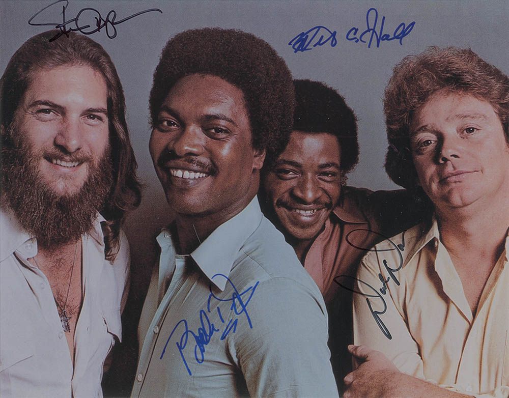 Color glossy 14 x 11 photo, signed in blue and black felt tip by Booker T, Steve Cropper, Willie Hall and Duck Dunn. In fine condition, with a light surface mark to the upper left.