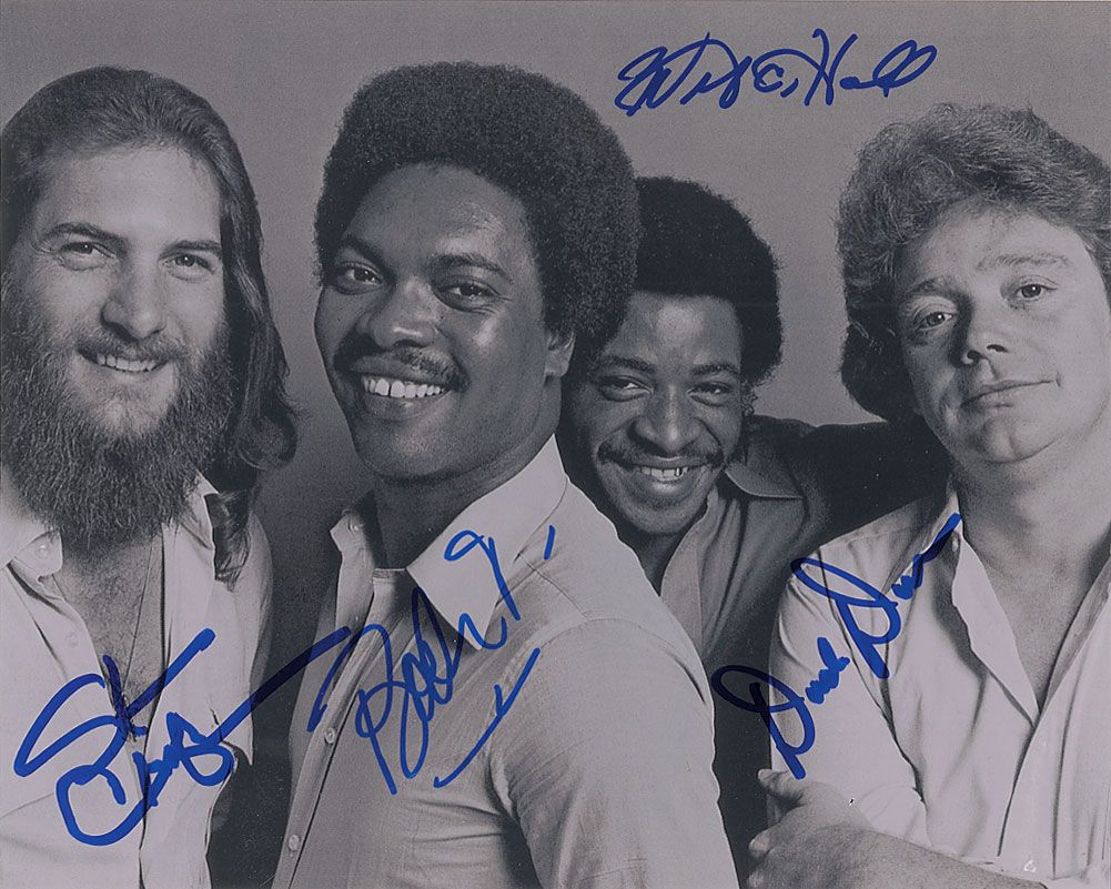 Glossy 10 x 8 group photo, signed in blue felt tip by Booker T, Steve Cropper, Willie Hall, and ‘Duck’ Dunn. In very fine condition.