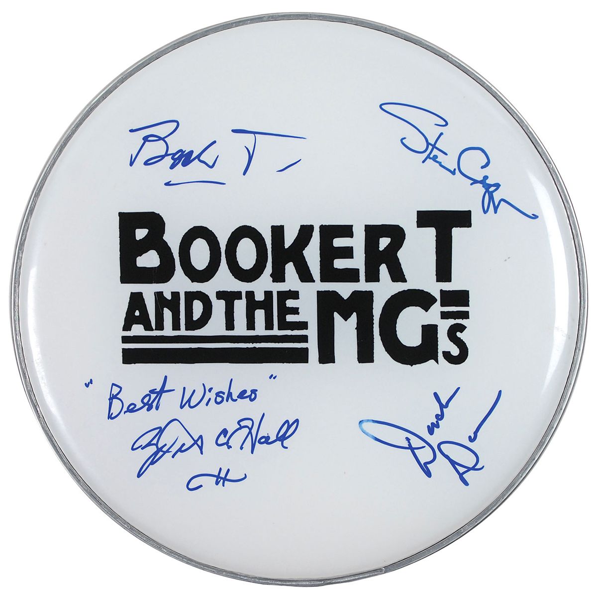 Unused 12? off-white drumhead, with the band’s name across the middle, signed in blue felt tip by Booker T., Steve Cropper, ‘Duck’ Dunn, and Willie Hall. In fine condition.