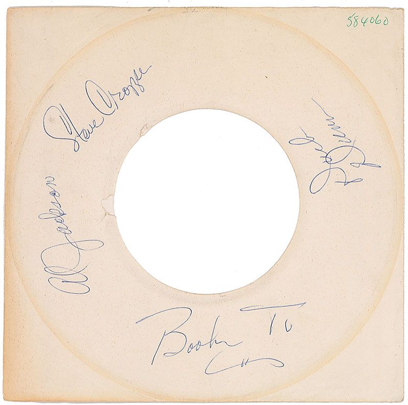 Blank off-white 45 rpm record sleeve, signed in blue ballpoint by Booker T., Steve Cropper, ‘Duck’ Dunn, and Al Jackson. In fine condition, with scattered light toning, album impression, and a small ink notation.