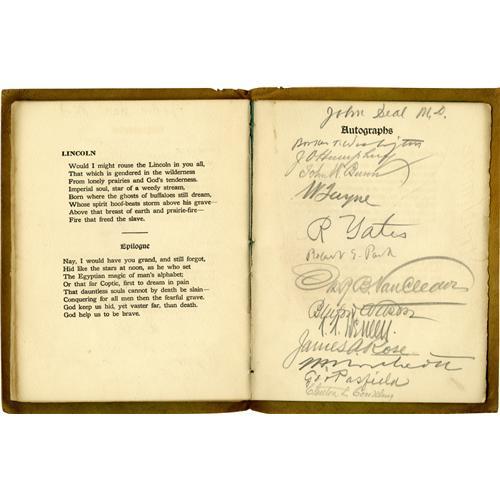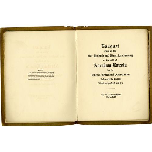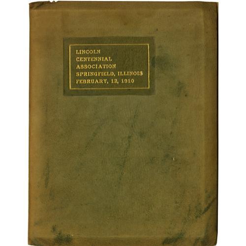<B> Booker T. Washington Signs a 1910 Lincoln's Birthday Program; He was a Feature Speaker</B></I> The program has a brown suede cover, and is gold-embossed "Lincoln Centennial Association", Springfield, Illinois, February 12, 1910. It measures 6" x 8". The autographed page, one of the last two pages (cleanly separated) is written in pencil, and shows the signature of Booker T. Washington among other notables of the time. The program is for a "Banquet given on the One Hundred and First Anniversary of the birth of Abraham Lincoln by the Lincoln Centennial Association February the twelfth Nineteen hundred and ten The St. Nicholas Hotel Springfield" There is a tipped-in copy of a portrait of Lincoln, a menu, and a roster of speakers, which shows an address by Booker T. Washington about "Some Results of Abraham Lincoln's Emancipation Proclamation." There is a poem illustrating the position of Lincoln among the dominating personalities of history, and the autograph page. A great association piece linking the Great Emancipation to one of the early American black leaders, who was himself born into slavery. Rare.