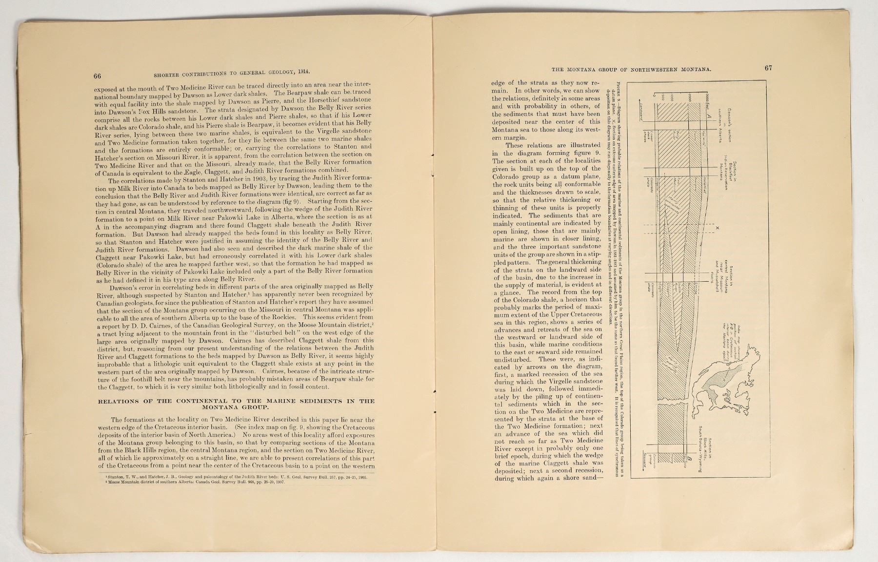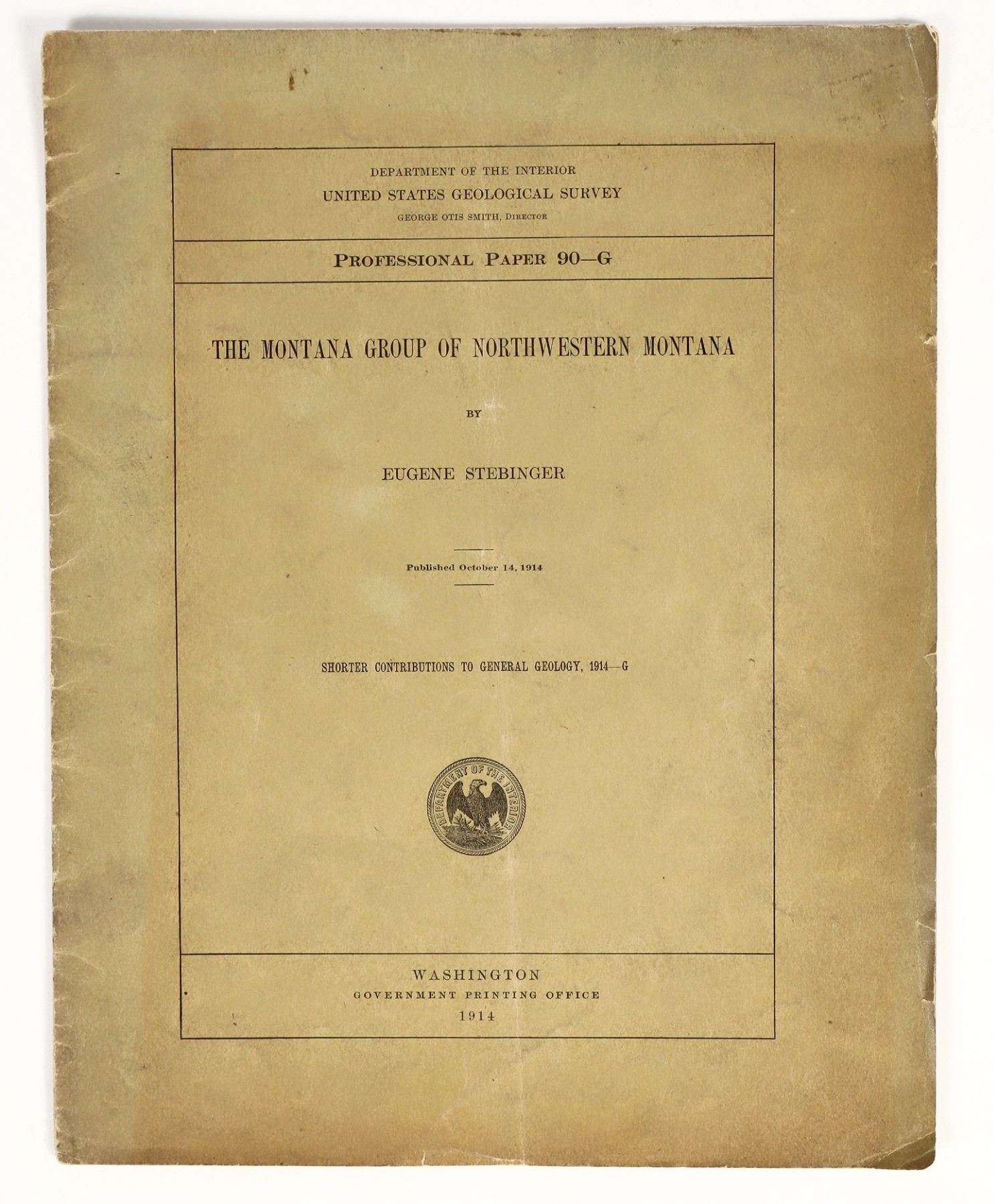 This item is a pamphlet by Eugene Stebinger titled "The Montana Group of Northwestern Montana," which was published in Professional Paper 90-G on October 14, 1914. This booklet provides a geological overview of the Montana group in and around the Blackfeet Indian Reservation in northwest Montana. It talks about how the Montana group formations are similar to those in southern Alberta but very different from those of the Judith River type area and related formations on the Missouri and Musselshell rivers in the state's central region. The pamphlet is 68 pages long.
