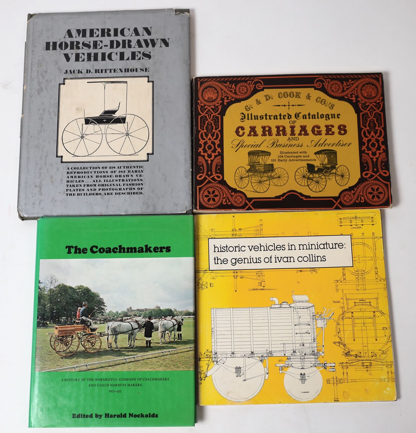 4 books about carriages. American Horse-drawn Vehicles by Rittenhouse, Illustrated Catalogue of Carriages by Cook, historic vehicles in miniature: the genius of Ivan Collins. The Coachmakers by Nockolds.
