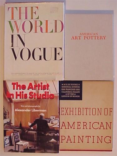 AMERICAN ART POTTERY, Henzke; EXHIBITION OF AMERICAN PAINTING FROM THE DE YOUNG MUSEUM; THE ARTIST IN HIS STUDIO, 1988, Liberman, Random House; THE WORLD IN VOGUE, Holme, Viking Press, three hardbound and one softbound, Vogue with worn dust jacket, De Young Museum and Vogue in good condition, Pottery and Artist’s Studio in very good condition. (4) STARTING BID $20. ESTIMATE $20 TO $1000