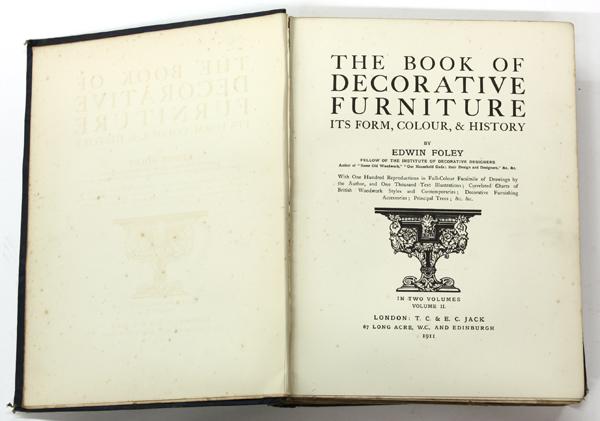 (Lot of 2) Books, two volumes The Book of Decorative Furniture its form, colour and history, Volumes I and II, Edwin Foley, London, T.C. and E.C. Jack, 16 Henrietta Street, W.C., and Edinburgh, 1910, each volume: 12'' x 9.75'' x 2.75''
