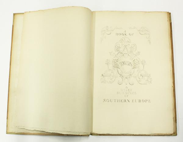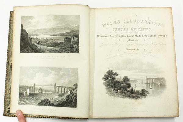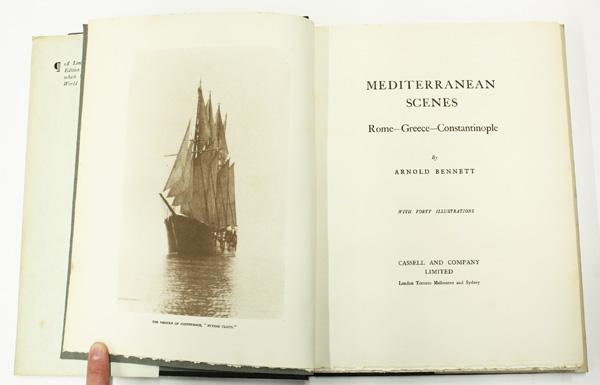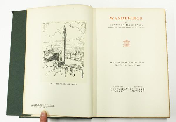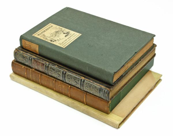 (lot of 4) Books, on European and World travel, including Wanderings, Clatyton Hamilton, drawings by Ernest C. Piexotto, 1925, Wales Illustrated, in a series of views, comprising the Picturesque Scenery, Towns, Castles, Seats of Nobility and Gentry, engraved from original drawings by Henry Eastman, London, published by Jones & Co. Temple of the Muses, Finsbury Square, 1830, bound in leather with gilt decoration, Mediterranean Scenes, Rome-Greece- Constantinople, Arnold Bennett, with forty illustrations, Cassell and Company, edition of 1000, this being number 429, with the book plate of Crosby Gaige, with a custom made slipcase, and A Book of Towers and Other Buildings of Southern Europe, with 24 drypoint plates by Richard Wyndham, London, Etchells and MacDonald, 1928, Humphrey Milford, Oxford University Press, one of 350 copies, this being number 158