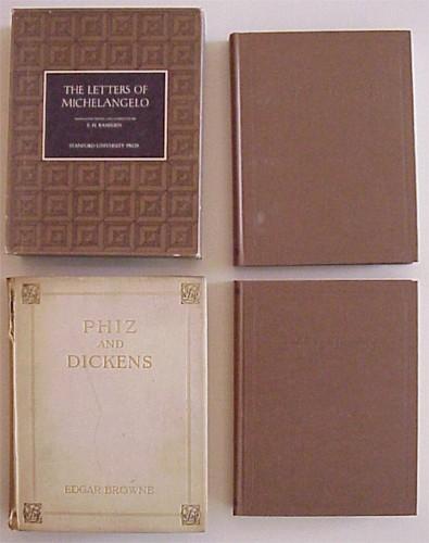 THE LETTERS OF MICHELANGELO (2 Vols), Ramsden, Stanford University Press, 1st edition, in slip case; PHIZ & DICKENS, 1913, Browne, 1st edition, cover damaged, some water damage to pages (top edge near spine), both hardbound, both in good condition. (3 total) STARTING BID $20. ESTIMATE $20 TO $1000