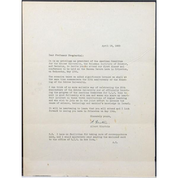 EINSTEIN, ALBERT. 1879-1955. Typed letter signed on Einstein's personal blind-embossed Princeton, New Jersey letterhead, dated April 19, 1950. E...