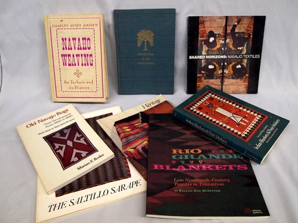 8 Books and Pamphlets on Navajo Weavings. Here are 2 hardback books and 6 soft back or pamphlets on weavings of the southwest, one on Saltillo (Mexico) sarapes and one on natural dyes, among others. The titles are: Indian Blankets of Their Makers (a 213 page republication of an 1914 original); Navajo Weaving Its Technic and Its History (a 261 page hardback); Natural Dyes in the United States (160 page hardback); Old Navajo Rugs ( a 1981 113 page softback); Shared Horizons: Navajo Textiles (a softback); 1988 Issue 3 ''Colorado Heritage'' periodical; Rio Grande Blankets (1992 83 page softback); The Saltillo Sarape (1978 97 page softback on the Santa Barbara Museum of Art Exhibition). The largest softbacks measure 8'' x 11.5''.