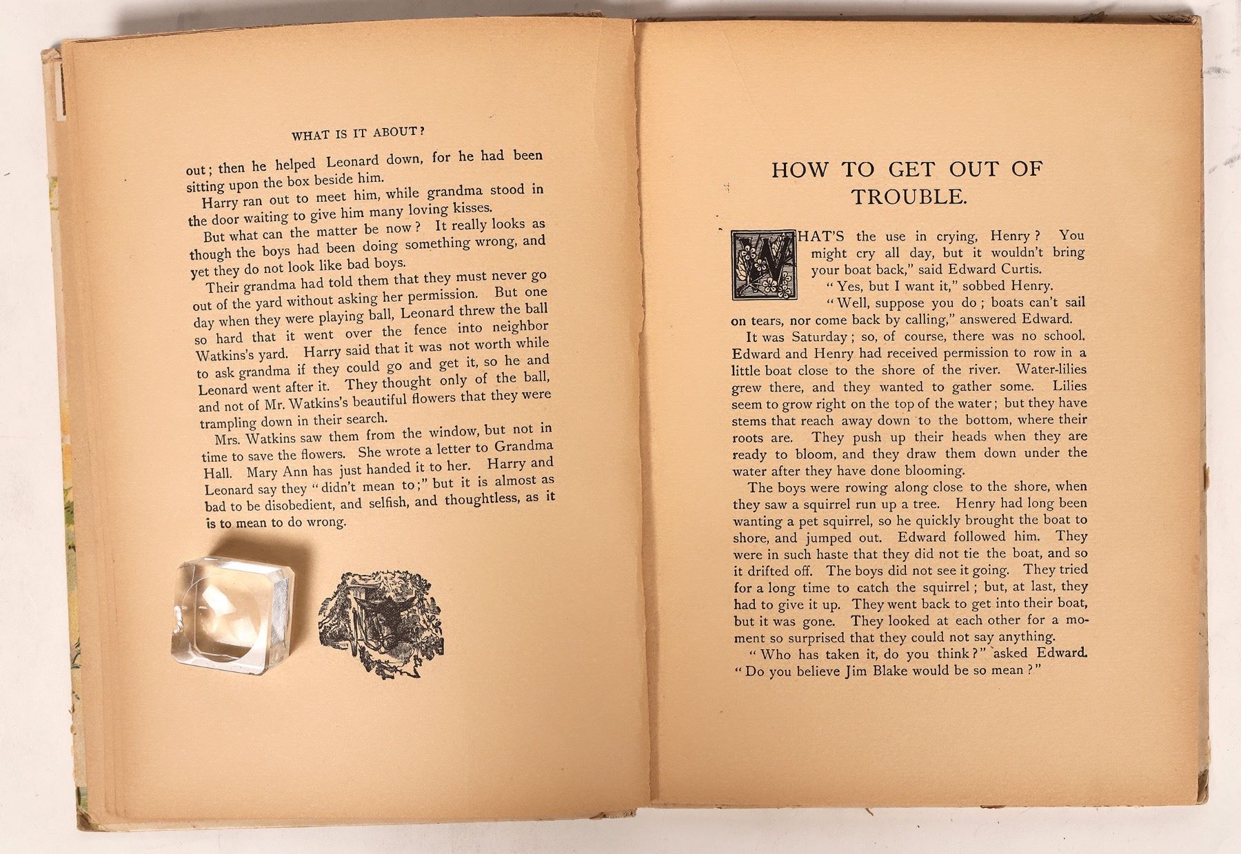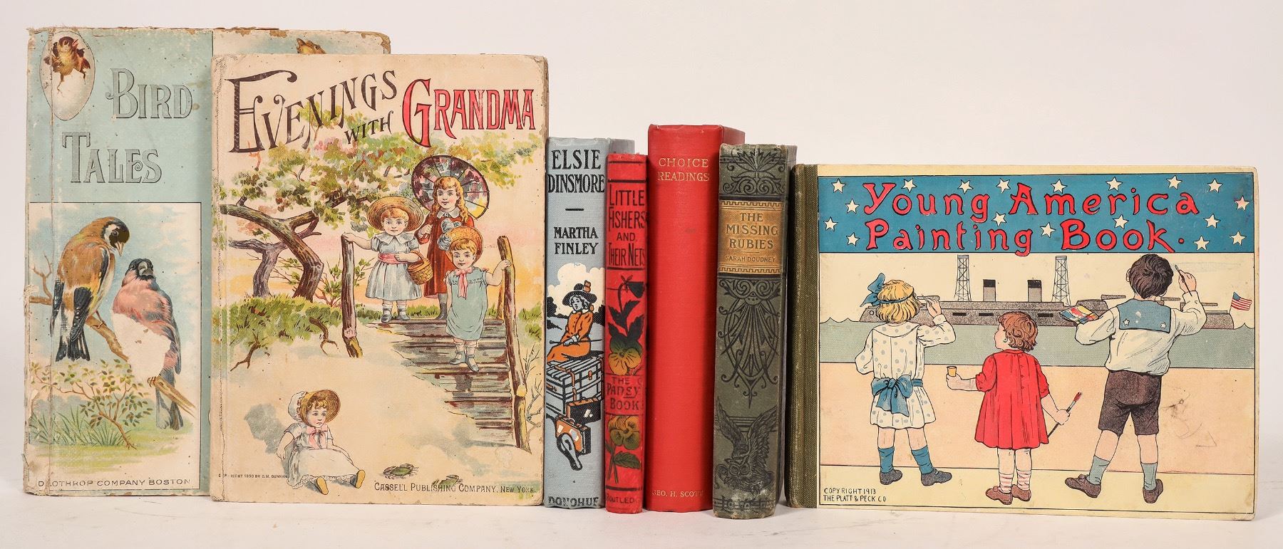 Several with attractive bindings. Evenings with Grandma, Young America Painting Book 1913, Bird Tales-binding in fair condition, Little Fishers and Their Nets, Choice Readings for the Home Circle, The Missing Rubies by Doudney, Elsie Dinsmore by Finley.