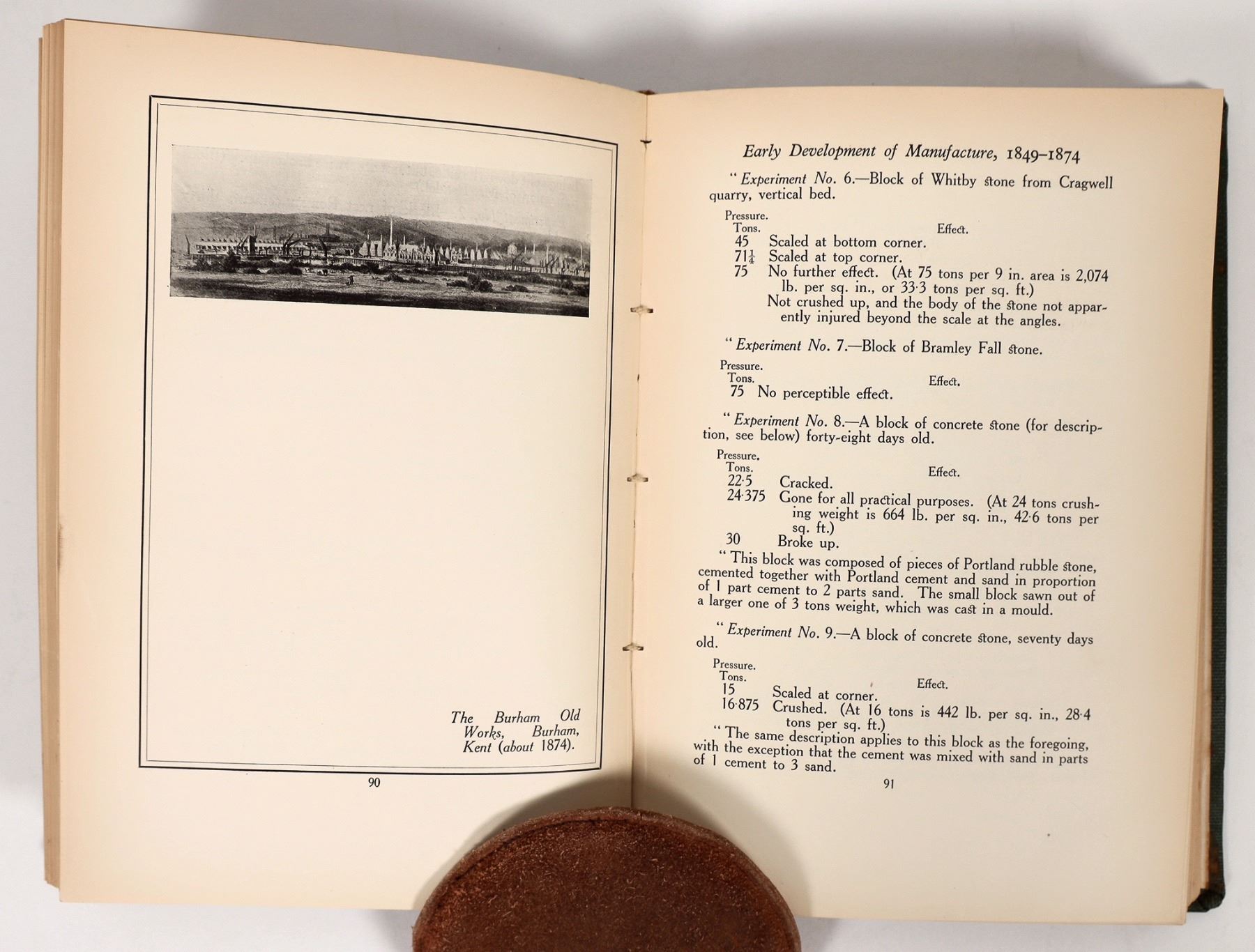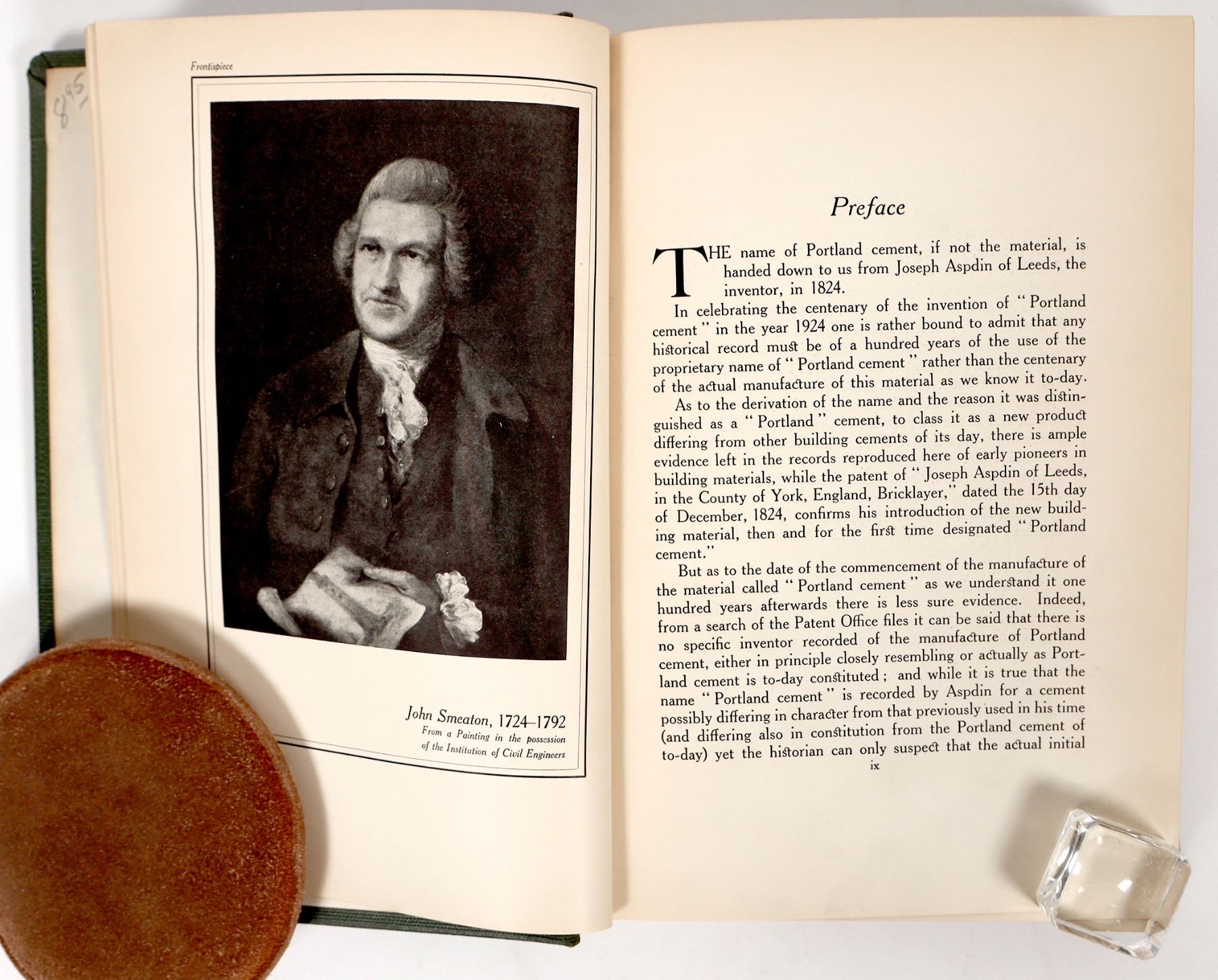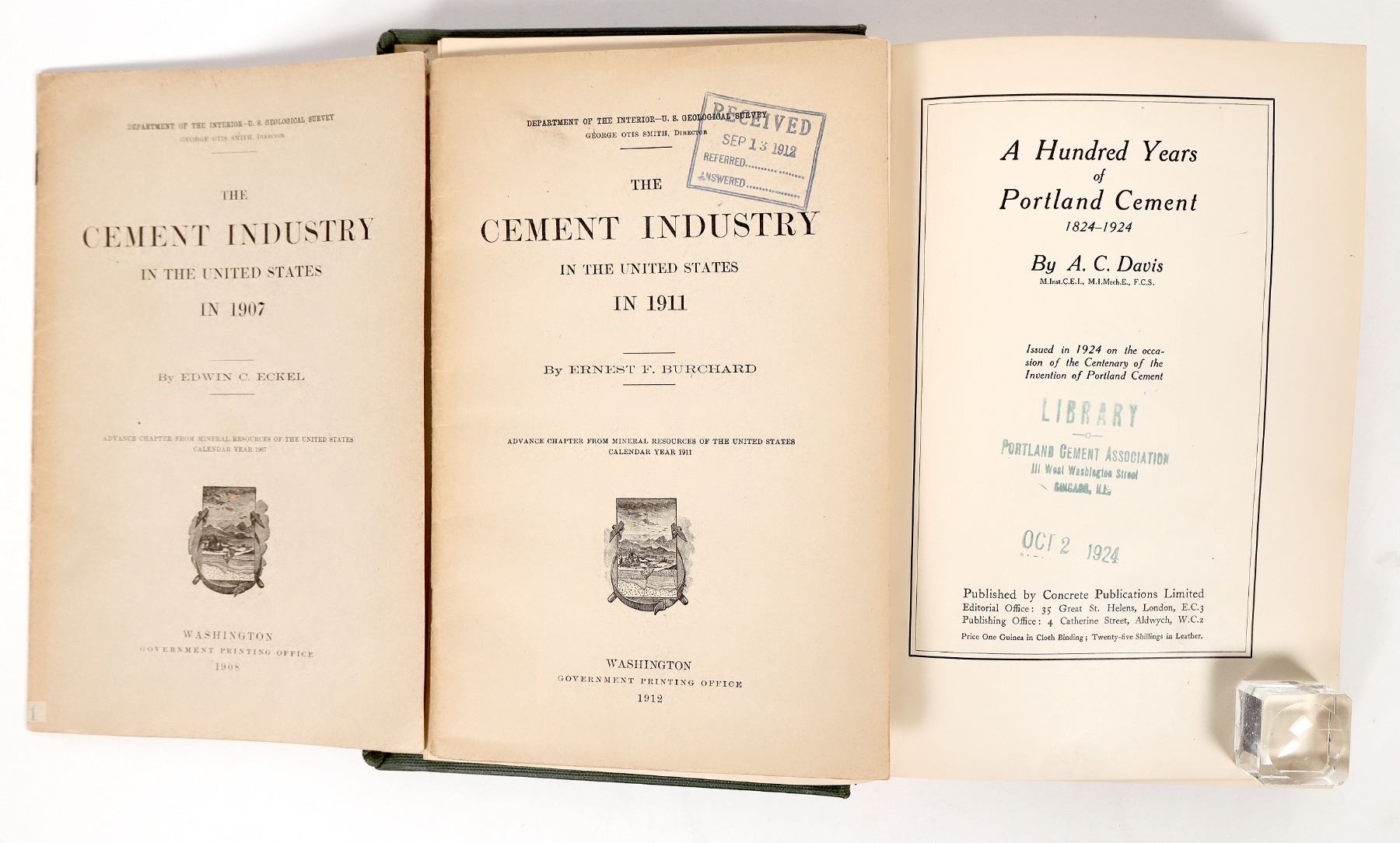A group of one book and two booklets on the history of cement in the United States: 'A Hundred Years of Portland Cement' by A.C. Davis (1924), 'The Cement Industry in the United States in 1907' by Edwin C. Eckell (1908), and 'The Cement Industry in the United States in 1911' by Ernest F. Burchard (1912). All in good condition, some minor wear on the A.C. Davis book.