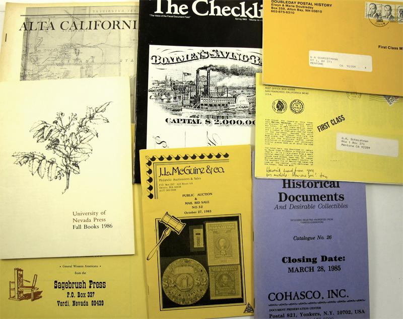 A comprehensive collection of Americana catalogs from a wide variety of vendors and dealers not only of Americana, but of tokens, exonumia, postal history, certificates, historical newspapers, et. al. A sampling of those included are: Sagebrush Press (Verdi, NV); International Bookfinders (Beverly Hills); Dawson's Book Shop (Los Angeles); University of Nevada Press; The Arthur H. Clark Co.; University of Oklahoma Press; Burkwood Books (Illinois); D.C. Allen (Michigan); World Exonumia (Rich Hartzog, IL); and many, many others. There are probably well over 1000 publications in the three boxes.