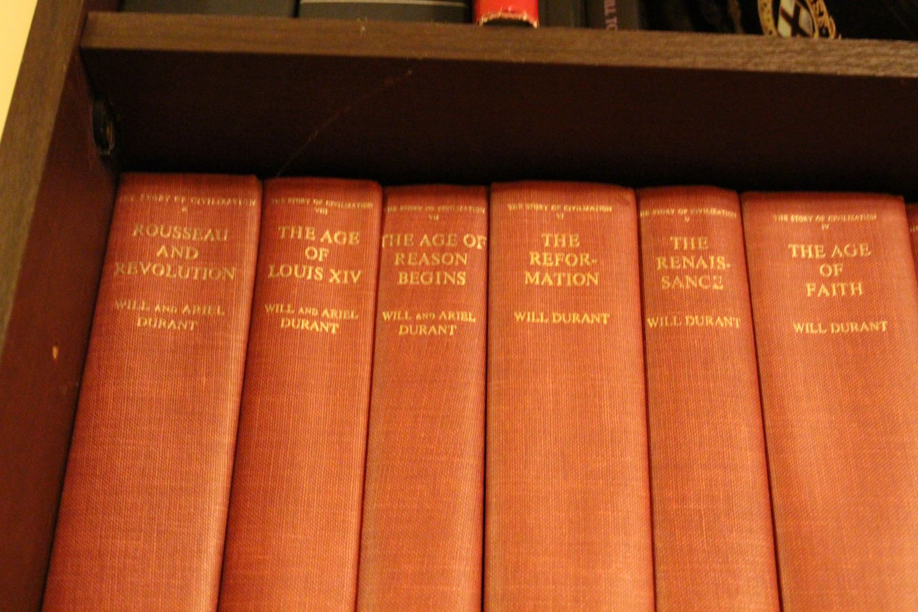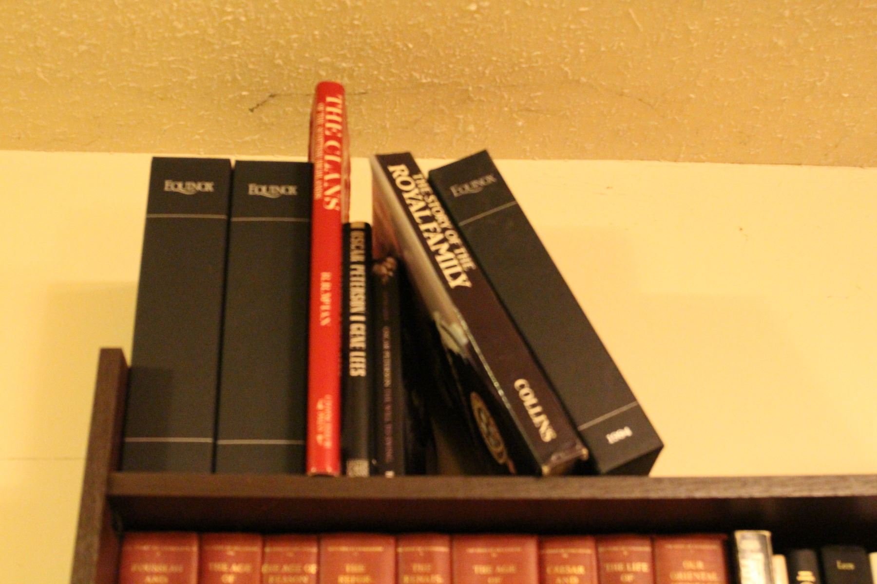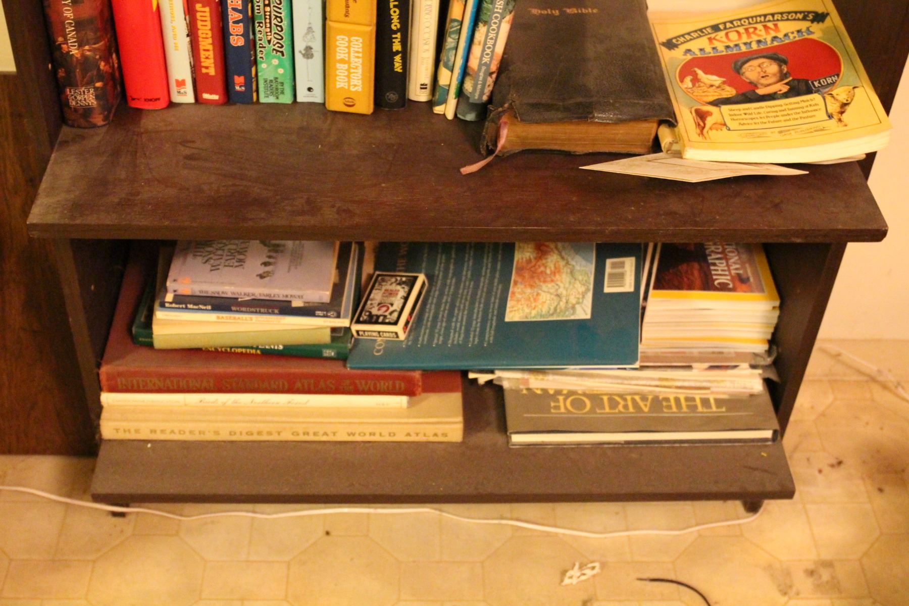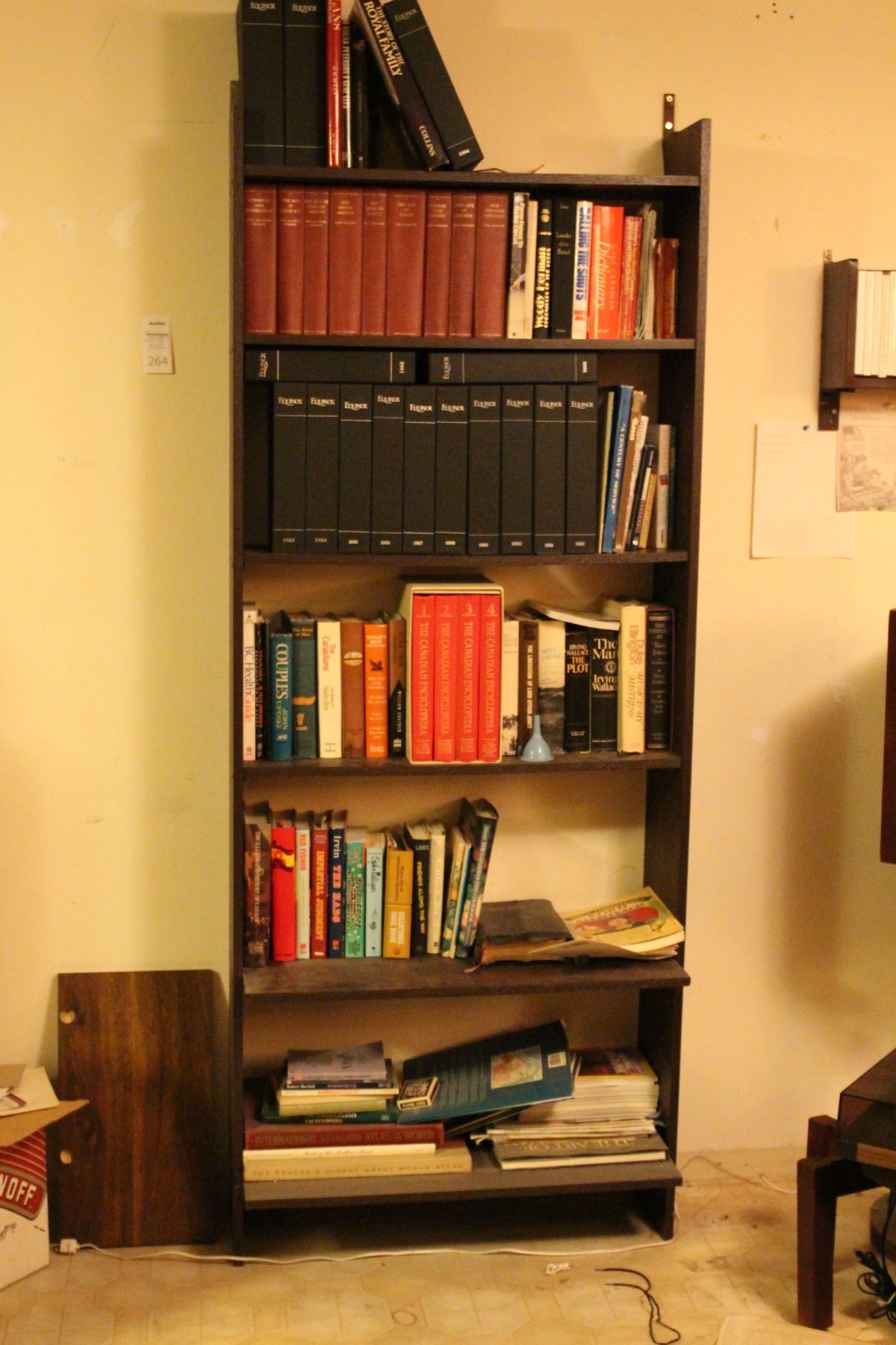 Wood bookshelf 30X10X78 note scratches & bring tools to dismantle from wall. Includes books Will & Ariel Durant's Story of Civilization 9 volumes, Equinox magazines & more. Heavy bring help to remove from home & packing materials. Pickup 10:00 - 11:00 am