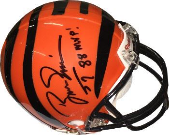 Following his final year at Maryland, Boomer Esiason was selected by the Cincinnati Bengals in the second round of the 1984 NFL Draft with the 38th overall pick. At his retirement in 1997 he was among the most successful quarterbacks in NFL history, finishing in the top 10 in many statistical categories. Boomer got his first pro start on October 7, 1984, in Cincinnati in a game against the Houston Oilers. Esiason won the 1988 NFL MVP award and was named to the Pro Bowl. Boomer Esiason has hand signed this Cincinnati Bengals Mini Helmet WITH 88 MVP!. MAB Hologram and Certificate of Authenticity from Athlon Sports Collectibles.