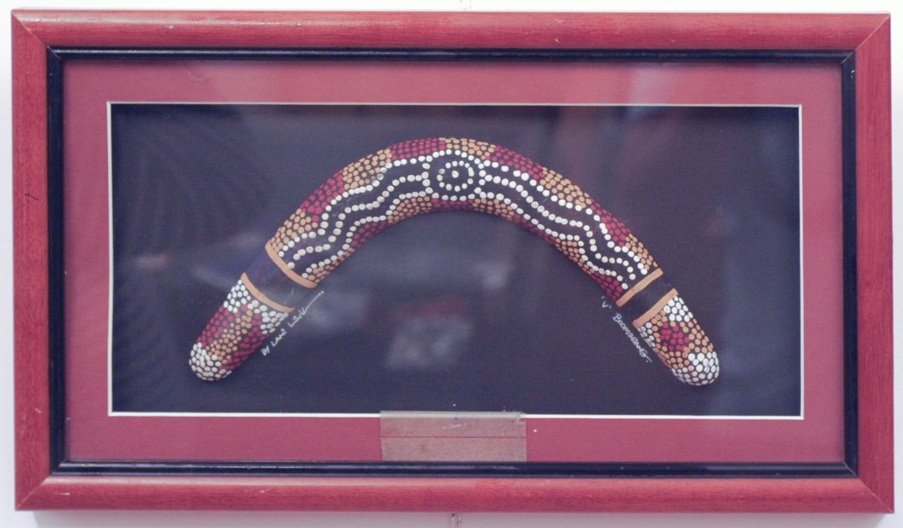Boomerang designed by Lani Link, hand-painted, framed, dimensions (frame): 24.5X42.5 cm.