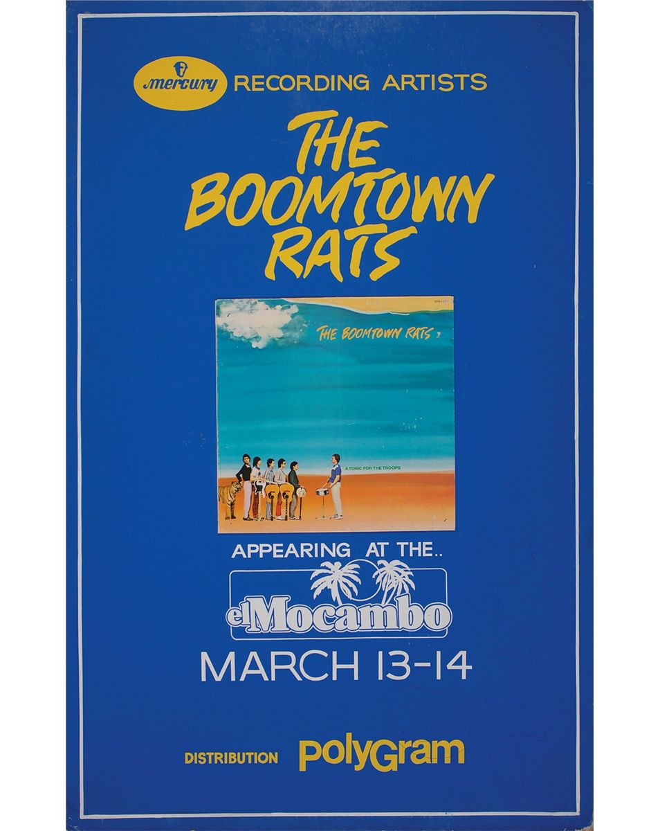 Original color painted promotional poster for the Boomtown Rats two-night engagement at Toronto’s El Mocambo Tavern. Upper portion bears the band’s name, with a A Tonic for the Troops album cover affixed to the center, and appearance information at the bottom. Signed vertically in blue ink, “10 years on, Bob Geldof.” Corner tip creases, some scattered edge wear, and some light surface rubbing, otherwise fine condition.