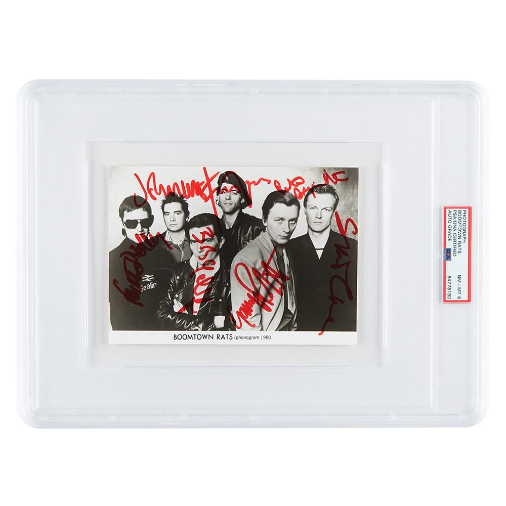 Glossy 7 x 5 promotional photo of the Boomtown Rats from 1980, signed in red felt tip by Johnnie Fingers, Pete Briquette, Gerry Cott, Simon Crowe, Bob Geldof, and Garry Roberts, who also signs on the reverse. In fine condition. Encapsulated and graded by PSA/DNA as "NM-MT 8."