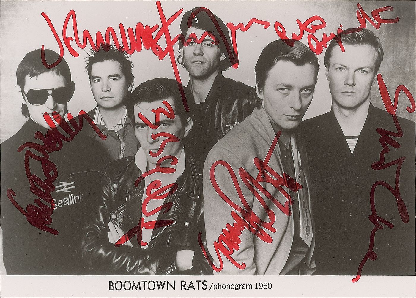 Glossy 7 x 5 promotional photo of the Boomtown Rats from 1980, signed in red felt tip by Johnnie Fingers, Pete Briquette, Gerry Cott, Simon Crowe, Bob Geldof, and Garry Roberts, who also signs on the reverse. In fine condition.