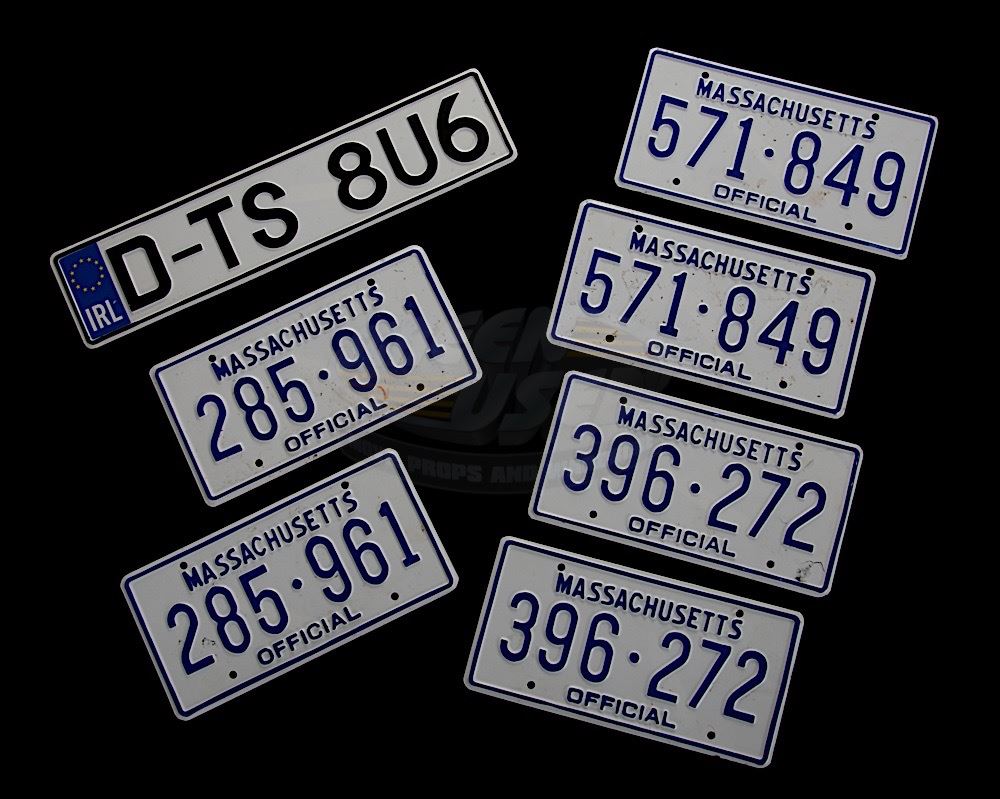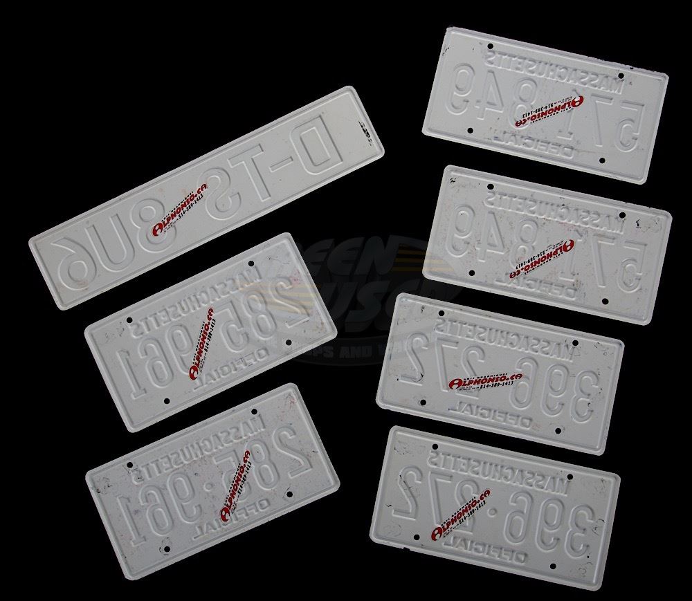 (Apparition, 2009) This set of seven prop license plates were custom-made by the production for use on various vehicles during filming. The plates are made of vacu-formed plastic with raised numbers and letters. Wear from use is present.