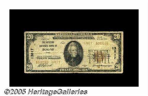 <B>Boone, IA</B></I> - $20 1929 Ty. 2 <B>The Citizens NB</B></I> Ch. # 13817<BR>A very scarce Boone bank which has just four entries in the new Kelly census. The Gengerke records concur, with the last offering from here coming almost eight years ago. <B>Very Good+.</B></I>