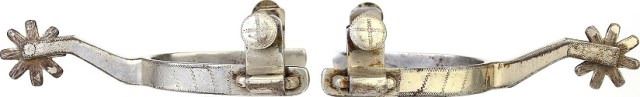 swinging buttons, 2" shanks, 1 1/8" - point rowels. Left side spur stamped on inside heel band, good original condition includes unmarked leather straps.