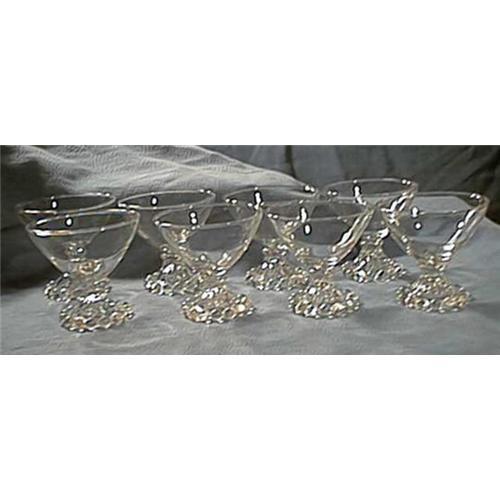 This wonderful set of eight sherbets are in Anchor Hocking's much collected Berwick pattern. The beaded footed pattern is commonly called Boopie. The excellent condition glasses measure 3 1/2" high and 3 5/8" wide.