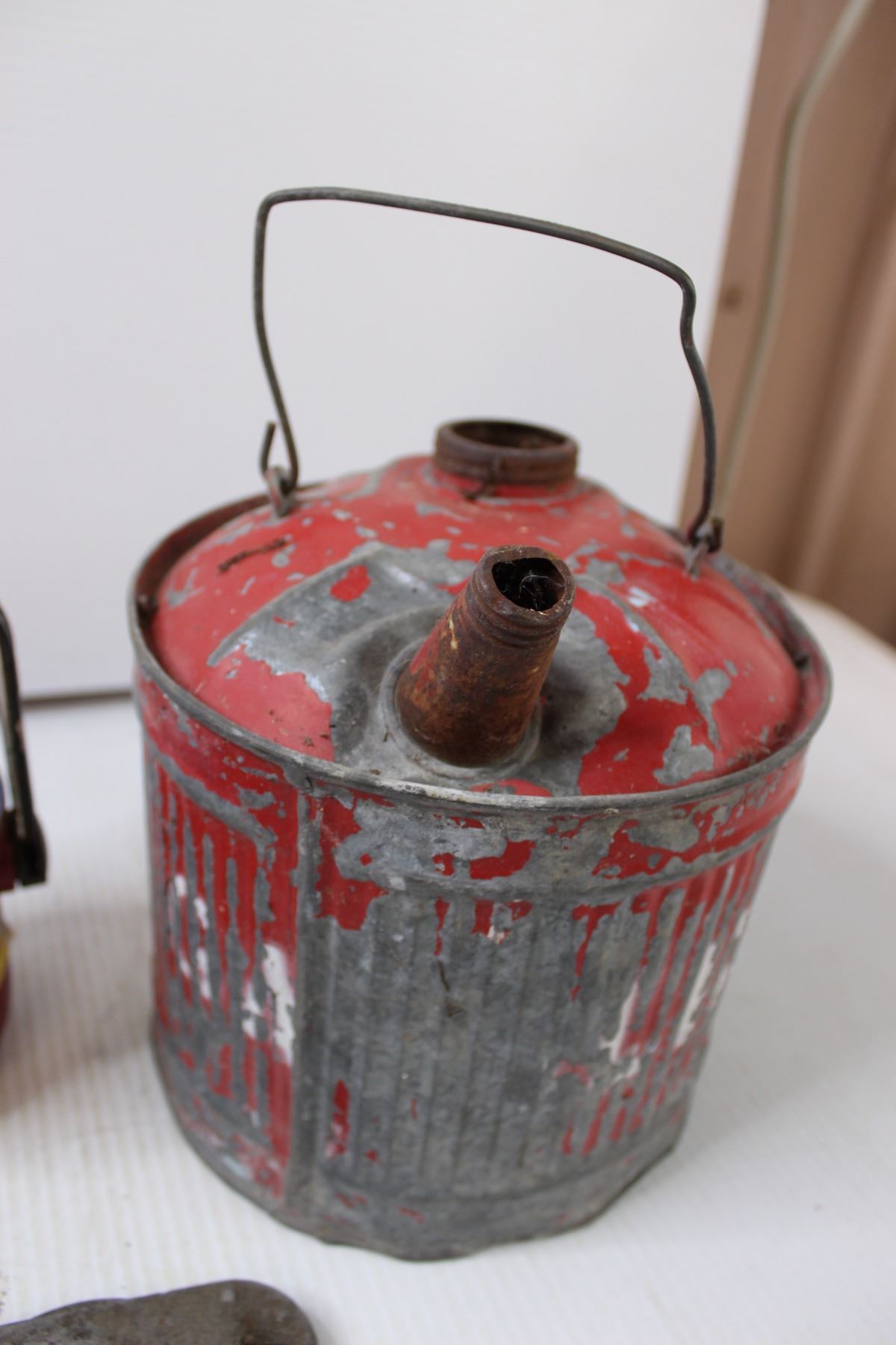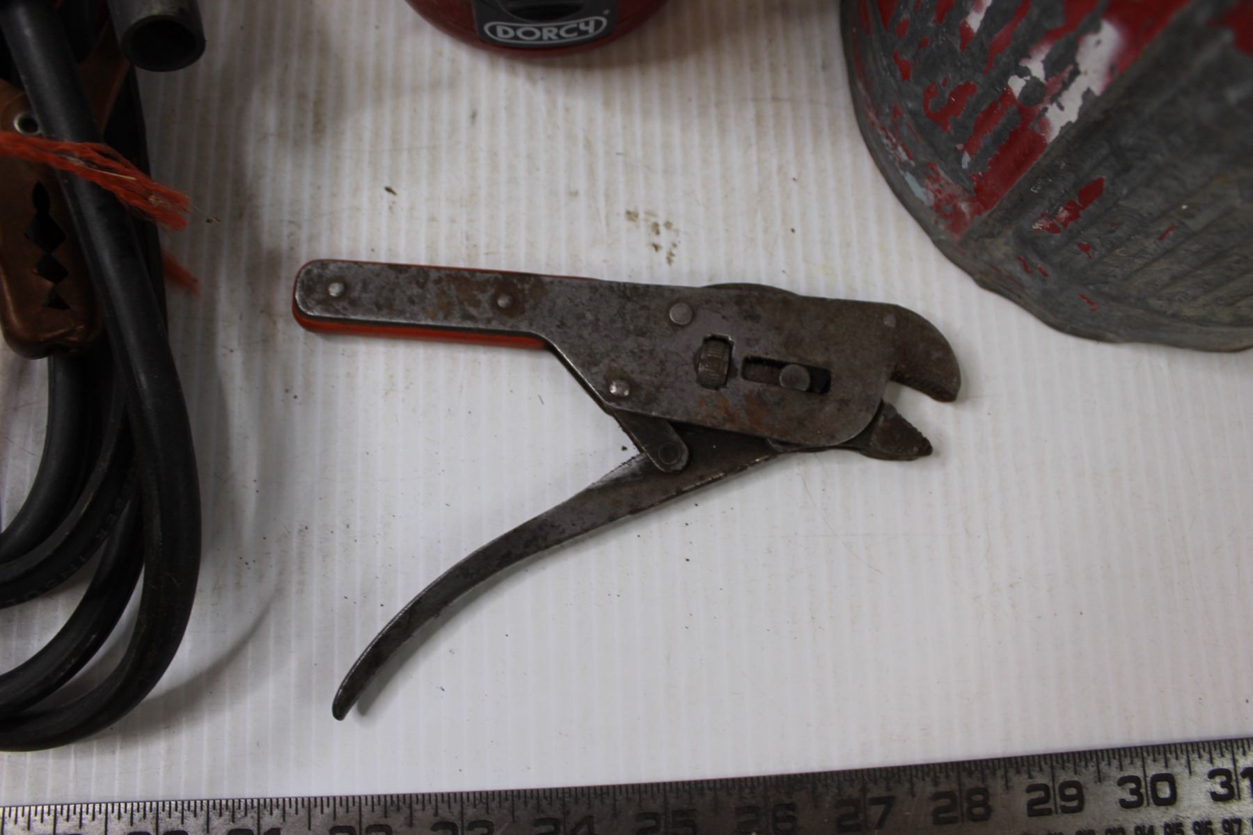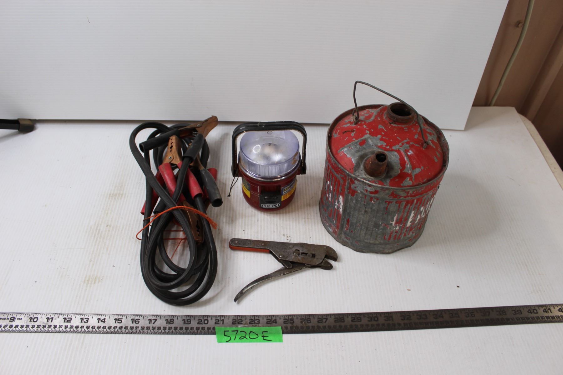 Booster Cables, Metal Gas Can, Focusing Light and Tool