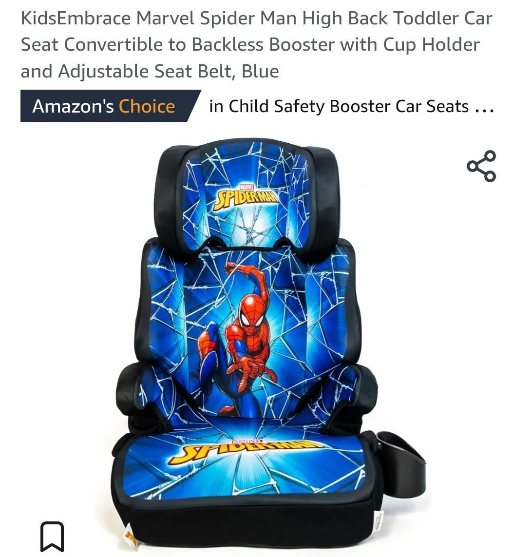 High back booster for kids, Spider-Man theme with cup holder, convertible design, new.