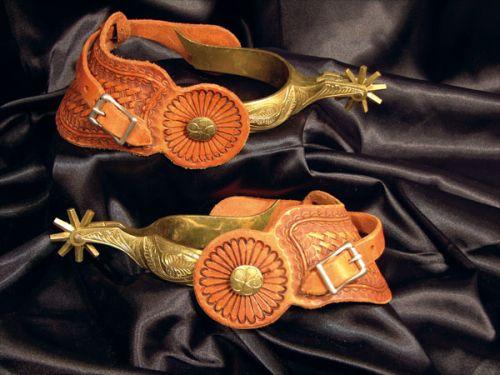 Boot Tipped Hand Chiseled Brass Spurs. Tooled leathers. Excellent condition.