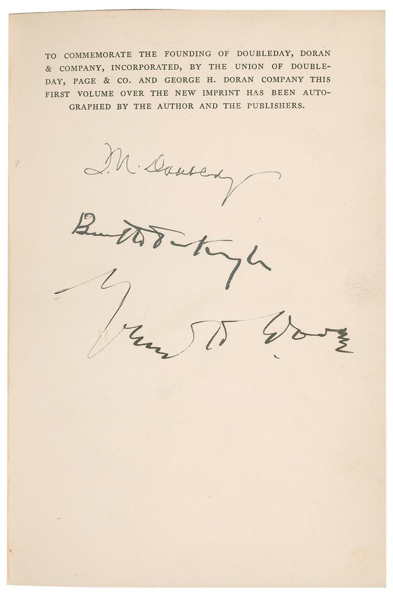Signed book: Claire Ambler. First edition. NY: Doubleday, 1928. Hardcover, 5.5 x 7.75, 253 pages. Signed in fountain pen on a limitations page by Tarkington and publishers Frank Nelson Doubleday and George H. Doran. In fine condition, with light toning to the pages and scattered soiling and staining to the boards and spine.