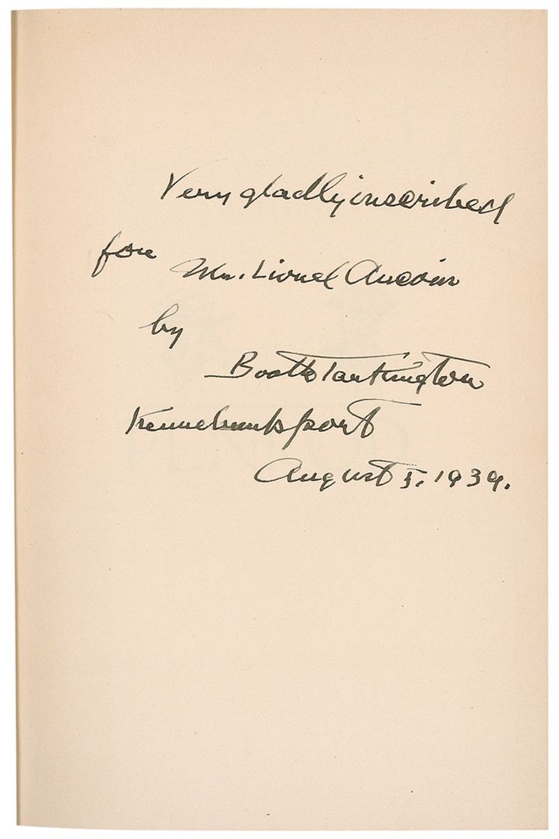 Signed book: Penrod. NY: Grosset and Dunlap, 1914. Hardcover with dustjacket, 5.25 x 7.75, 306 pages. Signed and inscribed on the first free-end page, “Very gladly inscribed for Mr. Lionel Aucoin by Booth Tarkington, Kennebunkport, August 5, 1939.” In fine condition.