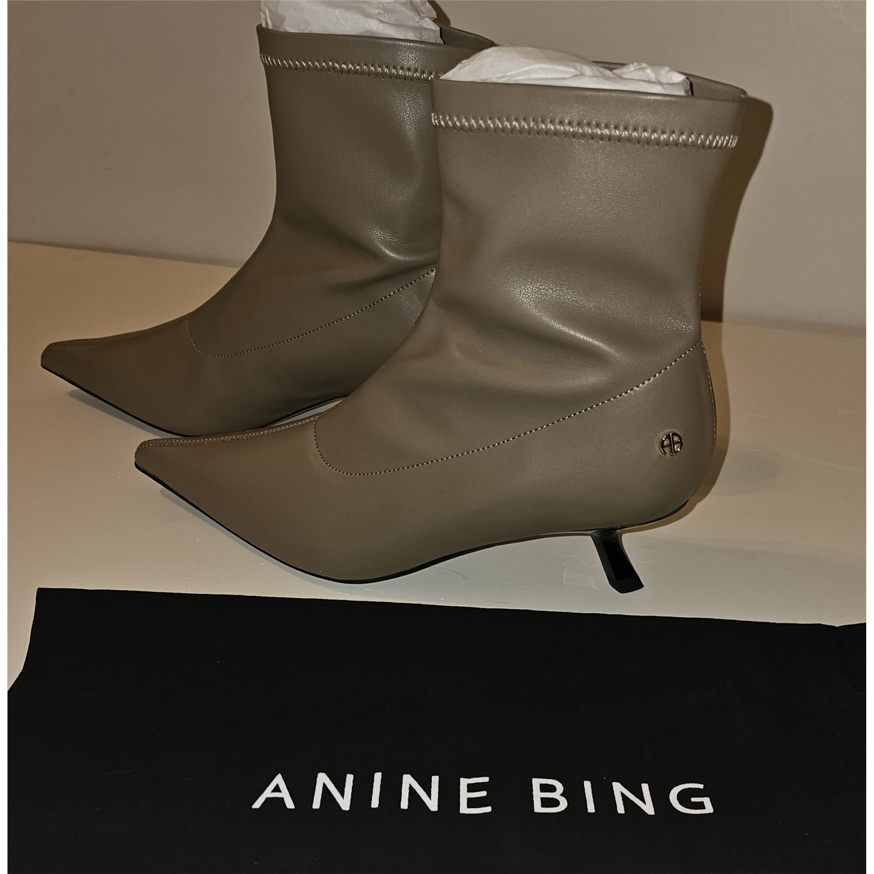 Anine Bing taupe leather boots with pointed toe and signature emblem, including dust bag, new.