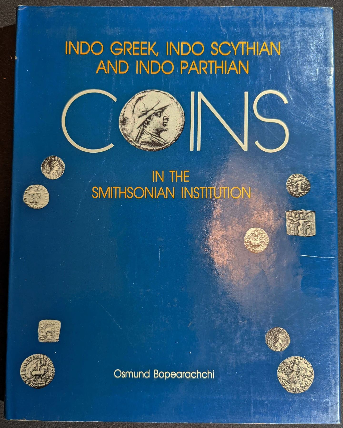 Bopearachchi, Osmund. INDO GREEK, INDO SCYTHIAN AND INDO PARTHIAN COINS IN THE SMITHSONIAN INSTITUTION. The National Numismatic Collection - Smithsonian Institution. 1993. 4to. viii, 143 (1) pages. Washington, D.C. original blue boards, gilt, dust jacket. map. 41 plates of coins. Fine. This book is a catalog based on two main categories of coins in the Smithsonian Institution: the General Collection, and the Malakand Hoard. The general collection of Graeco Bactrian and Indo-Scythian coins, 275 in number, is made of three major donations: by Raymond J. Hebert, former curator of the National Numismatic Collection, Smithsonian Institution, by W.F. Spengler, numismatist and collector, and by Markoff-Moghadam, former American Officer in Tehran. The group of 257 coins, known as the Malakand hoard named after its presumed find-spot. belongs to two dynasties; Indo Scythian: Azes II (114 specimens), Azes II with Aspavarma, (3 specimens), and Indo-Parthian: Gondophares, (85 specimens), Abdagases, (55 specimens). These coins are in excellent state of preservation and represent various types and new monograms. Their major characteristics have enabled the author to carry out metrological studies and to draw several conclusions regarding the development of the post Azes coinage and their relationship with the Indo-Parthian coinage of Gondophares and Abdagases. A significant catalogue. Lot weight: 2 lbs 2oz. Subject(s): Ancient Coinage.